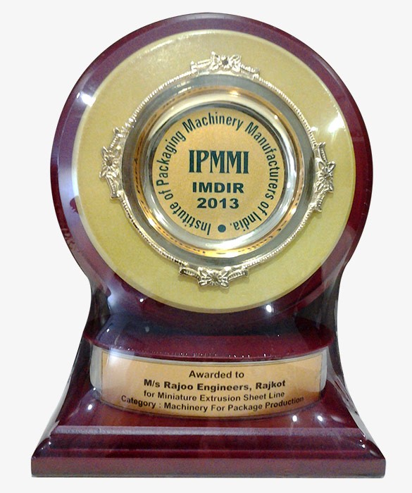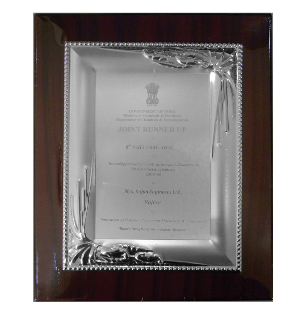 Rajoo Engineers is recognized for as a Joint Runner up of 6th National Award for technology innovation in petrochemicals & downstream plastics Processing Industry (2015-16) for its contribution to technology innovation in the category of innovation of polymer processing machinery and equipment - Rajoos Tilting Mould Thermoformer-Dispotilt.