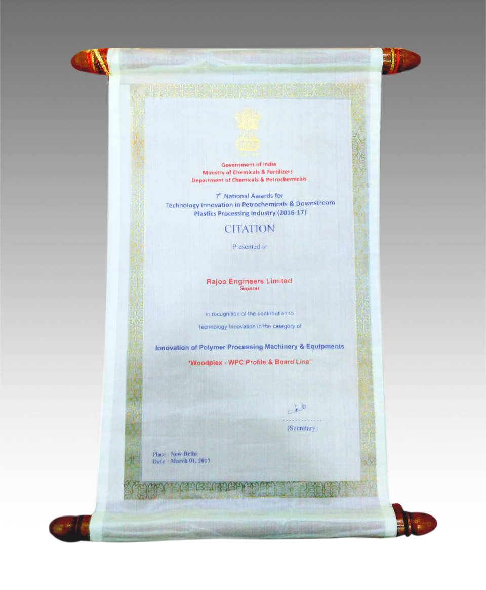 On 1st March, 2017, Citation presented in recognition of the contribution to technology innovation in the category of Innovation of Polymer Processing Machinery & Equipments for the Innovation in Woodplex - WPC Profile & Board Line " as Runner Up for 7th National Award for Technology Innovation in Petro Chemicals & Down Steam plastics Processing Industry (2016-17)