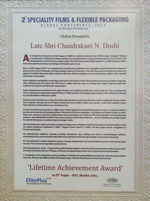 Late Shri Chandrakant N. Doshi awarded Lifetime Achievement Award in recognition of his contribution to the innovations in Plastics Processing machinery segment and to the global plastics fraternity by the CPMA & Elite Plus in the 2nd Speciality Films & Flexible Packaging Global Conference - 2013 held on 29th & 30th August in Mumbai.