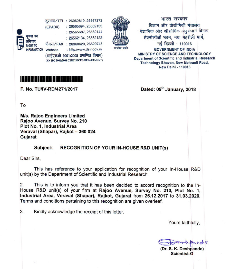 The Company received the 'DSIR' (Government of India) certification for its in-house R&D center named as 'Rajoo Innovation Centre