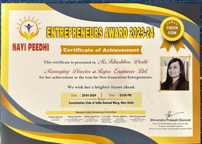 Ms. Khushboo Doshi , Managing Director - Rajoo Engineers Limited has been awarded "Nayee Pidhi Entreneure award -2024 " for her achievement as the icon for the new generation entrepreneur